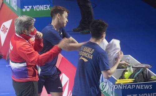 epa09494916 Marcus Gideon and Kev Sukamuljo of Indonesia take a break during the 2021 Sudirman Cup Men Doubles badminton match against Mads Kolding and Frederik Sogaard of Denmark in Vantaa, Finland, 29 September 2021. EPA/MAURI RATILAINEN