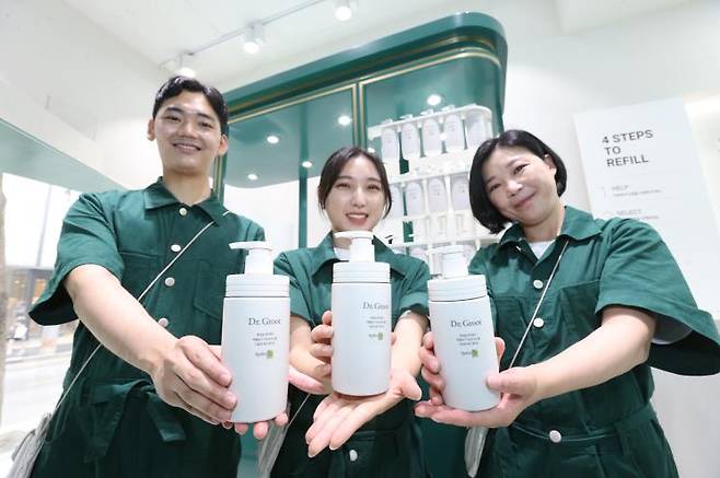친환경 가치 소비에 관심있다면 LG생활건강이 서울 신사동 가로수길에 위치한 ‘엘 헤리티지 1947’에 주목할 것. 지난 5월 이마트 죽전점에 이어 두 번째로 오픈한 이곳은 ‘빌려쓰는 지구 리필스테이션’을 컨셉트로 샴푸와 바디워시의 내용물을 리필 용기에 소분해 판매해 화장품 용기 배출을 최소화할 수 있도록 돕는다. 리필 스테이션에서 활용되는 사진 속 용기는 코코넛 껍질을 활용해 플라스틱 사용량을 약 30% 절감할 뿐 아니라 라벨 또한 물이 닿으면 쉽게 분리되는 수(水) 분리 라벨을 적용했다. 리필 스테이션에서는 화장품 내용물을 원하는 만큼 소분해 구매할 수 있으며 LG생활건강 브랜드인 닥터그루트, 벨먼, 피지오겔 등의 제품을 자유롭게 체험해볼 수 있다.