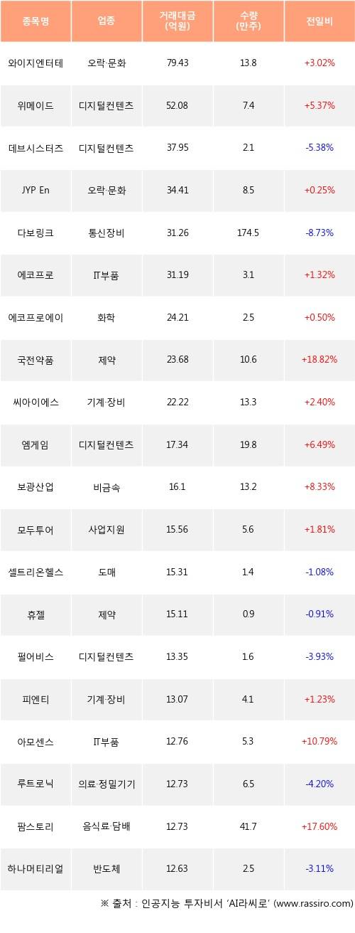 와이지엔터테인먼트, 위메이드, JYP Ent. 등은 전일 대비 주가가 상승했고, 데브시스터즈, 다보링크, 셀트리온헬스케어 등은 주가가 하락했다.