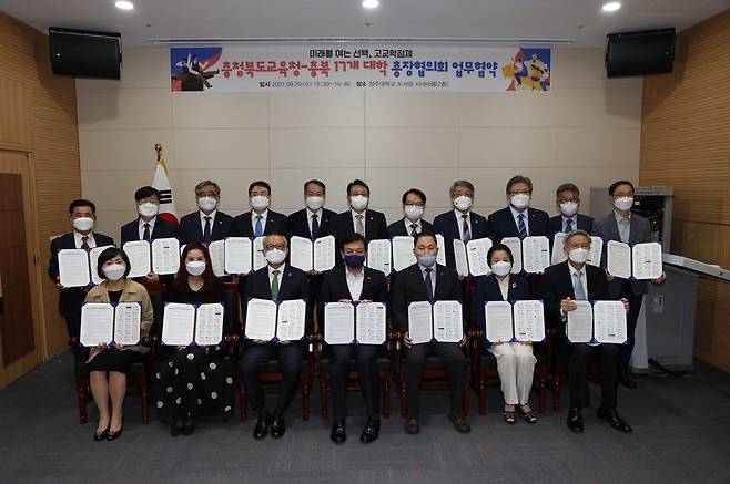 (청주=연합뉴스) 충북도교육청과 충북지역 대학총장협의회가 29일 청주대에서 고교학점제 지원 등을 위한 업무협약을 했다. 사진은 협약서 들고 기념 촬영하는 김병우 충북도교육감(앞줄 가운데). 2021.9.29 [충북도교육청 제공. 재판매 및 DB 금지]