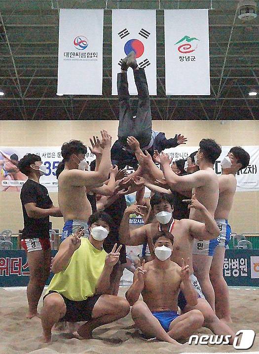 (서울=뉴스1) = 29일 경상남도 창녕군 창녕국민체육센터에서 열린 '제35회 전국시·도대항장사씨름대회(2차)' 대학교부 단체전에서 우승한 경기대학교 선수들이 헹가래를 하고 있다. (대한씨름협회 제공) 2021.9.29/뉴스1