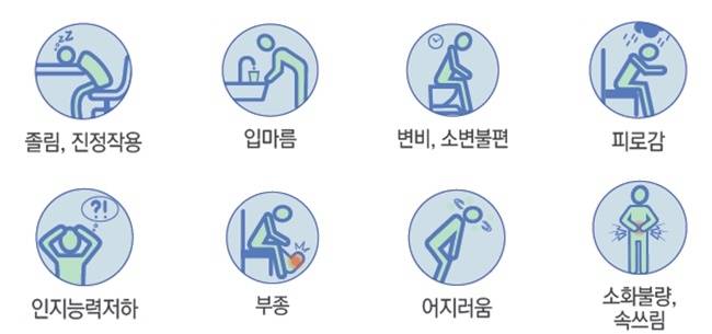 노인층에서 흔히 나타나는 부작용으로는 졸림, 입마름, 변비, 소변불편, 피로, 부종, 어지러움, 속쓰림 등이 있다. 여러 가지 약을 복용하는 노인은 새로운 증상이 나타나면 약의 부작용을 유념하여, ‘가나다’ 를 기억하고 실천해야 한다.