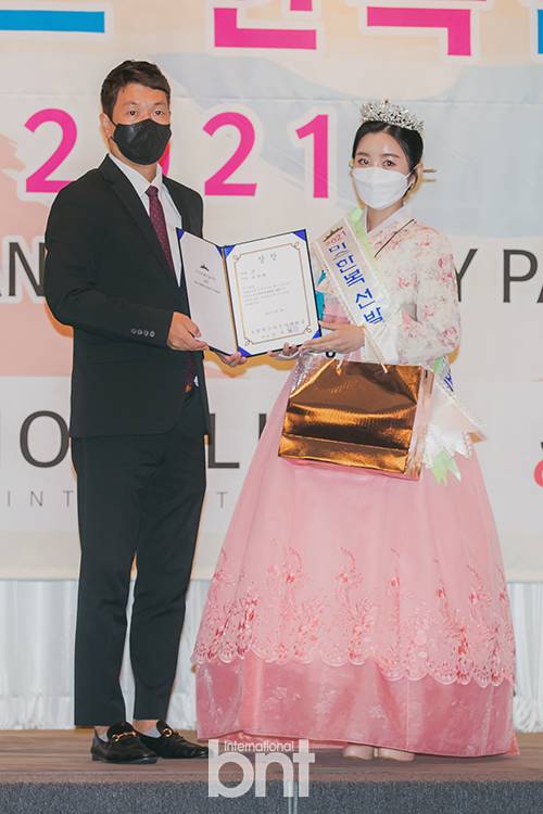[bnt포토] '2021 미스(미시즈) 한복선발대회'에서 기념촬영하는 미스 선 고은채-김철규 대표