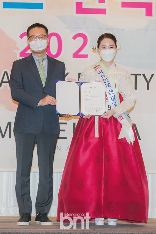 [bnt포토] '2021 미스(미시즈) 한복선발대회'에서 기념촬영하는 미스 숙 차유심-박의훈 대표