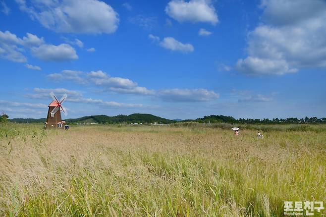 삘기꽃이 배경이 되고, 갈대가 배경이 된 풍차.
