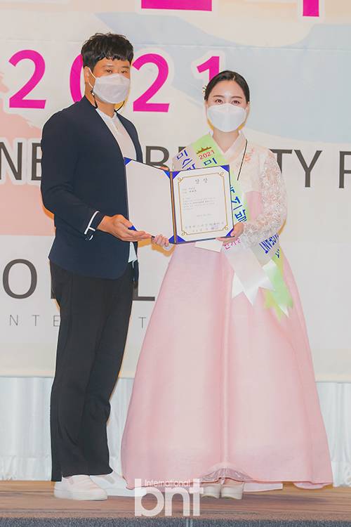 [bnt포토] '2021 미스(미시즈) 한복선발대회'에서 기념촬영하는 미스 인기상 박혜영-하재호 대표