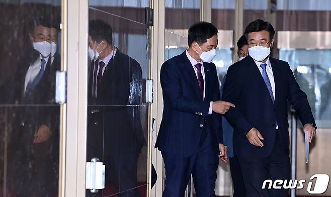 (서울=뉴스1) 구윤성 기자 = 윤호중 더불어민주당 원내대표와 김기현 국민의힘 원내대표가 29일 오후 서울 여의도 국회에서 박병석 국회의장 주재로 열린 언론중재법 관련 여야 원내대표 회동을 마친 뒤 의장실을 나서고 있다. 양당은 언론중재 및 피해구제 등에 관한 법률(언론중재법) 개정안을 당장 처리하지 않고 국회 특위를 만들어 연말까지 논의하기로 했다. 2021.9.29/뉴스1