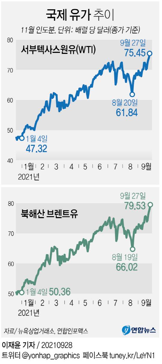 게다가 세계적으로 인플레이션을 자극하는 신호가 감지되면서 물가 상승 압력은 쉽게 줄지 않을 전망이다. 지난달 배럴당 60달러 중반까지 하락했던 국제유가는 최근 70달러 초중반대 수준으로 반등했고, 동북아지역 액화천연가스(LNG) 가격지표인 JKM은 지난해 7월 100만 BTU(열량단위)당 2.56달러에서 지난 24일 기준 27.49달러로 무려 10배 넘게 올랐다.