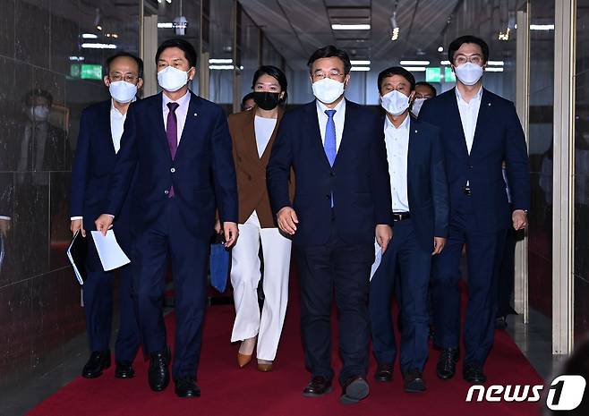 (서울=뉴스1) 구윤성 기자 = 윤호중 더불어민주당 원내대표와 김기현 국민의힘 원내대표가 29일 오후 서울 여의도 국회에서 박병석 국회의장 주재로 열린 언론중재법 관련 여야 원내대표 회동을 마친 뒤 의장실을 나서고 있다. 양당은 언론중재 및 피해구제 등에 관한 법률(언론중재법) 개정안을 당장 처리하지 않고 국회 특위를 만들어 연말까지 논의하기로 했다. 2021.9.29/뉴스1