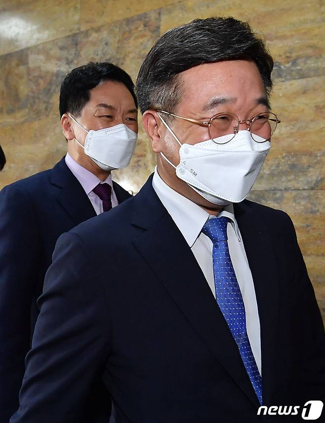 (서울=뉴스1) 구윤성 기자 = 윤호중 더불어민주당 원내대표와 김기현 국민의힘 원내대표가 29일 오후 서울 여의도 국회에서 박병석 국회의장 주재로 열린 언론중재법 관련 여야 원내대표 회동을 마친 뒤 발걸음을 옮기고 있다. 양당은 언론중재 및 피해구제 등에 관한 법률(언론중재법) 개정안을 당장 처리하지 않고 국회 특위를 만들어 연말까지 논의하기로 했다. 2021.9.29/뉴스1