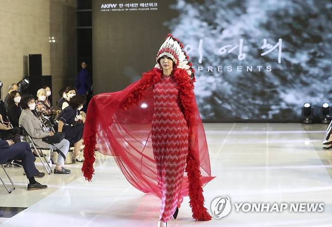 (부산=연합뉴스) 강덕철 기자 = 29일 오후 부산 해운대구 부산시립미술관에서 '2021 한·아세안 패션위크' 개막을 축하하는 이영희 패션쇼가 열리고 있다. 부산시립미술관과 벡스코에서 온라인 생중계로 다음 달 2일까지 열리는 이번 행사에는 우리나라와 아세안 10개국 총 27개 사 인기 패션디자이너들이 참가한다. 2021.9.29
