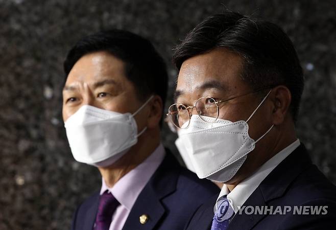 (서울=연합뉴스) 진성철 기자 = 더불어민주당 윤호중 원내대표(오른쪽)와 국민의힘 김기현 원내대표가 29일 서울 여의도 국회에서 국회 언론미디어제도개선 특별위원회를 구성해 언론중재법 개정안을 재논의하는 내용의 합의문을 발표한 뒤 취재진의 질문에 답하고 있다. 2021.9.29 [국회사진기자단]