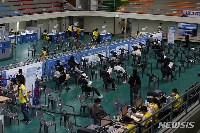 [속초=뉴시스] 김경목 기자 = 29일 오후 강원 속초시 생활체육관 코로나19 예방 백신접종센터에서 접종이 진행되고 있다. 속초에서는 오는 10월3일까지 사회적 거리두기 4단계가 적용된다. 2021.09.29. photo31@newsis.com
