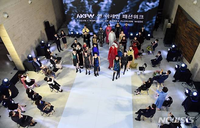 [부산=뉴시스] 하경민 기자 = 2021 한·아세안 패션위크 개막 패션쇼가 29일 오후 부산 해운대구 부산시립미술관 로비에서 펼쳐지고 있다. 이번 행사는 개막 패션쇼를 시작으로 10월 2일까지 벡스코 제2전시장에서 아세안 디자이너들의 패션필름, 한국 디자이너 패션쇼, 부산지역 9개 대학 패션페스티벌, 제2회 아세안 패션 발전 디지털 화상 포럼 등이 진행되며, 특히 코로나19 감염 확산을 위해 지난해에 이어 올해도 무관중 온라인 생중계로 공개한다. 2021.09.29. yulnetphoto@newsis.com