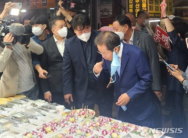 [안동=뉴시스] 김진호 기자 = 국민의힘 대권 후보인 홍준표 의원이 29일 경북 안동시 중앙신시장을 방문해 떡을 맛보고 있다. 2021.09.29 kjh9326@newsis.com