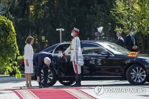 epa09495051 German President Frank-Walter Steinmeier (C) adjusts his clothes while Moldovan President Maia Sandu (L) welcome him at the Presidential Palace, in Chisinau, Moldova, 29 September 2021. EPA/DUMITRU DORU