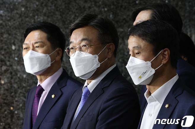 (서울=뉴스1) 구윤성 기자 = 윤호중 더불어민주당 원내대표와 김기현 국민의힘 원내대표가 29일 오후 서울 여의도 국회에서 박병석 국회의장 주재로 열린 언론중재법 관련 여야 원내대표 회동을 마친 뒤 취재진의 질문에 답하고 있다. 양당은 언론중재 및 피해구제 등에 관한 법률(언론중재법) 개정안을 당장 처리하지 않고 국회 특위를 만들어 연말까지 논의하기로 했다. 2021.9.29/뉴스1
