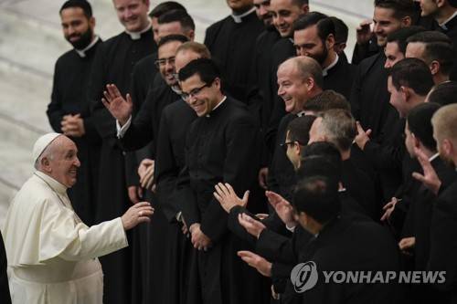 meets a group of seminarians during his weekly general audience in the Paul VI Hall at the Vatican, Wednesday, Sept. 29, 2021. (AP Photo/Alessandra Tarantino)
