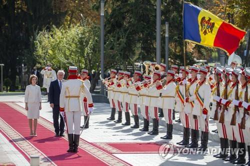 epa09495049 Moldovan President Maia Sandu (L) review the honor guard with German President Frank-Walter Steinmeier (2-L) at his arrival at the Presidential Palace in Chisinau, Moldova, 29 September 2021. EPA/DUMITRU DORU