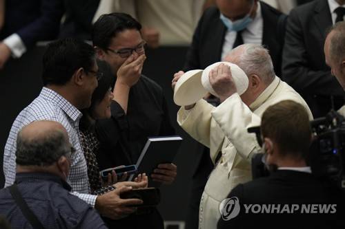 wears briefly a skull cap of a pilgrim during his weekly general audience in the Paul VI Hall at the Vatican, Wednesday, Sept. 29, 2021. (AP Photo/Alessandra Tarantino)