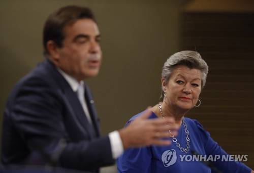 epa09495064 European Commission Vice-President for Promoting our European Way of Life, Margaritis Schinas and European Commissioner for Home Affairs, Ylva Johansson during press conference on developments under the New Pact on Migration and Asylum and stepping up the fight against migrant exploitation in Brussels, Belgium, 29 September 2021. EPA/OLIVIER HOSLET