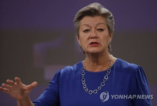 epa09495066 European Commissioner for Home Affairs, Ylva Johansson during press conference on developments under the New Pact on Migration and Asylum and stepping up the fight against migrant exploitation in Brussels, Belgium, 29 September 2021. EPA/OLIVIER HOSLET