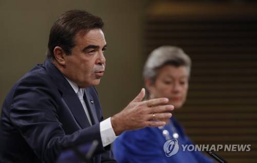 epa09495063 European Commission Vice-President for Promoting our European Way of Life, Margaritis Schinas and European Commissioner for Home Affairs, Ylva Johansson during press conference on developments under the New Pact on Migration and Asylum and stepping up the fight against migrant exploitation in Brussels, Belgium, 29 September 2021. EPA/OLIVIER HOSLET