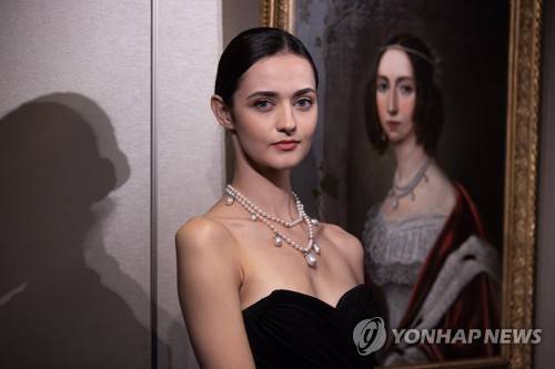 epa09495075 A model (L) wears Queen Josephine?s Pearl and Diamond Necklace next to a portrait of Augusta-Amelie of Bavaria (R) pictured wearing the same necklace, during a preview at Sotheby?s in Hong Kong, China, 29 September 2021. The necklace will be auctioned on 12 October 2021 in Hong Kong. EPA/JEROME FAVRE