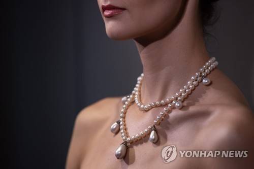 epa09495074 A model wears Queen Josephine?s Pearl and Diamond Necklace during a preview at Sotheby?s in Hong Kong, China, 29 September 2021. The necklace will be auctioned on 12 October 2021 in Hong Kong. EPA/JEROME FAVRE