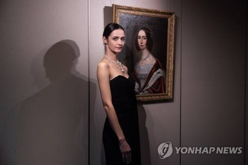 epa09495072 A model (L) wears Queen Josephine?s Pearl and Diamond Necklace next to a portrait of Augusta-Amelie of Bavaria (R) pictured wearing the same necklace, during a preview at Sotheby?s in Hong Kong, China, 29 September 2021. The necklace will be auctioned on 12 October 2021 in Hong Kong. EPA/JEROME FAVRE