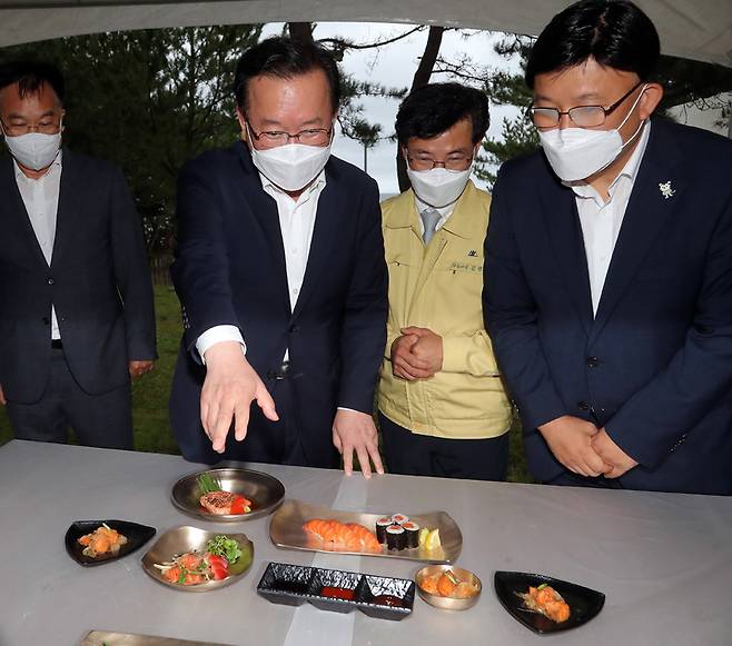 [강릉=뉴시스] 김경목 기자 = 29일 오후 김부겸 국무총리가 강원도 강릉시 연곡면 강원도 수산자원연구원 스마트 양식 클러스터 연구 현장에서 수산물로 만든 요리를 최복수 강원도 행정부지사(맨 오른쪽) 등과 보고 있다. (사진=강원도청 제공) 2021.09.29. photo@newsis.com
