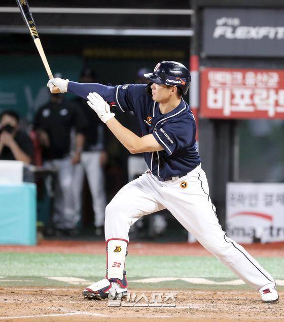 프로야구 KBO리그 두산 베어스와 KT 위즈의 경기가 29일 오후 수원 kt위즈파크에서 열렸다. 두산 김재환이 5회초 우익수 오른쪽 2루타를 날리고있다.