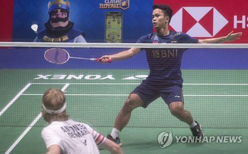 epa09495086 Anthony Sinisuka Ginting (back) of Indonesia in action against Anders Antonsen of Denmark during their men's singles game of the group stage tie between Indonesia and Denmark at the BWF 2021 Sudirman Cup Badminton tournament in Vantaa, Finland, 29 September 2021. EPA/MAURI RATILAINEN