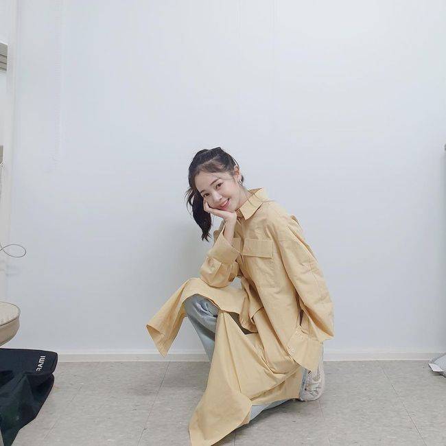 공개한 사진 속 김보미는 가을 분위기가 물씬 나는 의상을 입고 바닥에 앉아 포즈를 취하고 있다.
