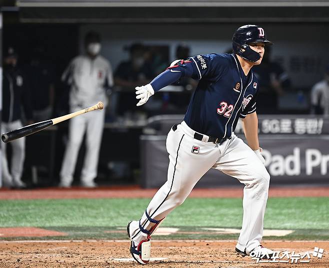 (엑스포츠뉴스 수원, 김한준 기자) 29일 오후 수원케이티위즈파크에서 열린 ‘2021 신한은행 SOL KBO리그’ 두산 베어스와 KT 위즈의 경기, 5회초 1사 1루 두산 김재환이 2루타를 날리고 있다.