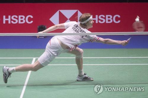 epa09495089 Anders Antonsen of Denmark in action against Anthony Sinisuka Ginting of Indonesia during their men's singles game of the group stage tie between Indonesia and Denmark at the BWF 2021 Sudirman Cup Badminton tournament in Vantaa, Finland, 29 September 2021. EPA/MAURI RATILAINEN