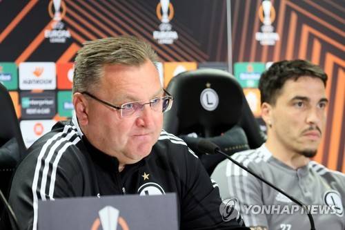 epa09495093 Legia Warsaw's head coach Czeslaw Michniewicz (L) and Josue Pesqueira (R) attend a press conference in Warsaw, Poland, 29 September 2021. Legia Warsaw will face Leicester City in their UEFA Europa League soccer match on 30 September 2021. EPA/Leszek Szymanski POLAND OUT