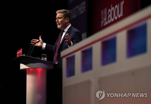 Leader of the British Labour Party Keir Starmer gestures as he makes his keynote speech at the annual party conference in Brighton, England, Wednesday, Sept. 29, 2021. (AP Photo/Alastair Grant)