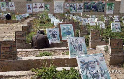 epa09495102 Houthi supporters visit the graves of their slain relatives at a cemetery dedicated to slain Houthi fighters who are allegedly killed in the country's ongoing conflict, in Sana'a, Yemen, 29 September 2021. Over 130 people have died, most of them were Houthi fighters, in the last two days of intense fighting between Saudi-backed Yemeni forces and the Houthis for control of the oil-rich province of Marib. The Houthis continue to intensify their ground offensive to seize Marib, the government's last northern stronghold, claiming the lives of hundreds of fighters in September so far. EPA/YAHYA ARHAB