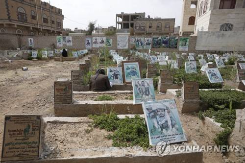 epa09495101 Houthi supporters visit the graves of their slain relatives at a cemetery dedicated to slain Houthi fighters who are allegedly killed in the country's ongoing conflict, in Sana'a, Yemen, 29 September 2021. Over 130 people have died, most of them were Houthi fighters, in the last two days of intense fighting between Saudi-backed Yemeni forces and the Houthis for control of the oil-rich province of Marib. The Houthis continue to intensify their ground offensive to seize Marib, the government's last northern stronghold, claiming the lives of hundreds of fighters in September so far. EPA/YAHYA ARHAB