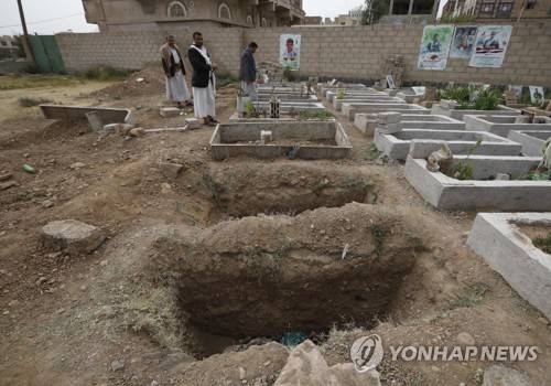 epa09495108 Yemenis pass freshly dug graves at a cemetery dedicated to slain Houthi fighters who are allegedly killed in the country's ongoing conflict, in Sana'a, Yemen, 29 September 2021. Over 130 people have died, most of them were Houthi fighters, in the last two days of intense fighting between Saudi-backed Yemeni forces and the Houthis for control of the oil-rich province of Marib. The Houthis continue to intensify their ground offensive to seize Marib, the government's last northern stronghold, claiming the lives of hundreds of fighters in September so far. EPA/YAHYA ARHAB
