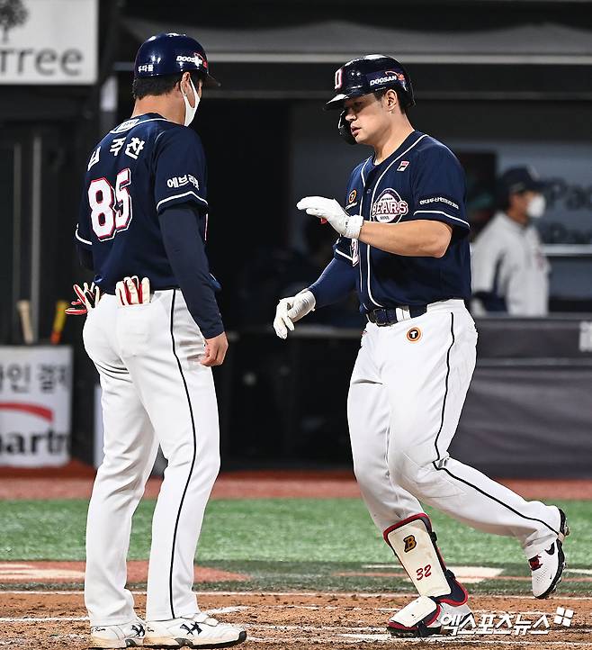 (엑스포츠뉴스 수원, 김한준 기자) 29일 오후 수원케이티위즈파크에서 열린 ‘2021 신한은행 SOL KBO리그’ 두산 베어스와 KT 위즈의 경기, 7회초 1사 두산 김재환이 솔로 홈런을 날린 후 김주찬 코치와 하이파이브를 하고 있다.