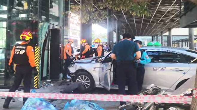 택시는 인도로 올라선 뒤에도 15m가량을 달린 뒤, 승강기를 들이받고 멈춰 섰습니다.