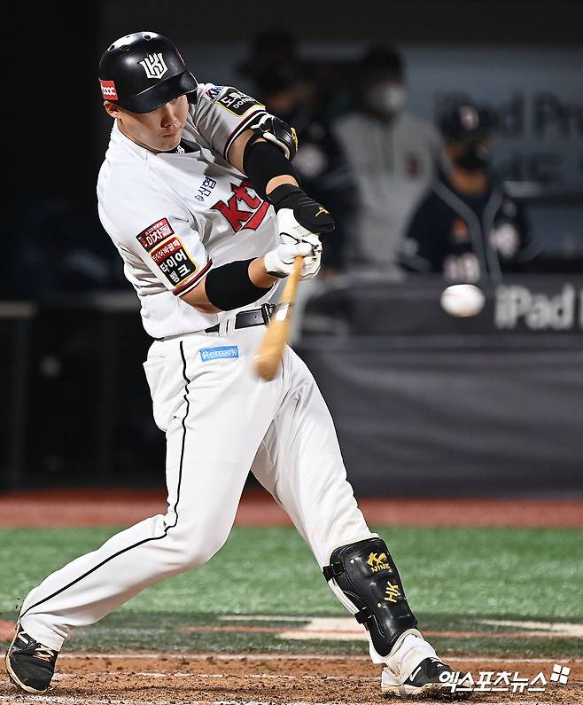 (엑스포츠뉴스 수원, 김한준 기자) 29일 오후 수원케이티위즈파크에서 열린 ‘2021 신한은행 SOL KBO리그’ 두산 베어스와 KT 위즈의 경기, 7회말 KT 이홍구가 좌전안타를 날리고 있다.