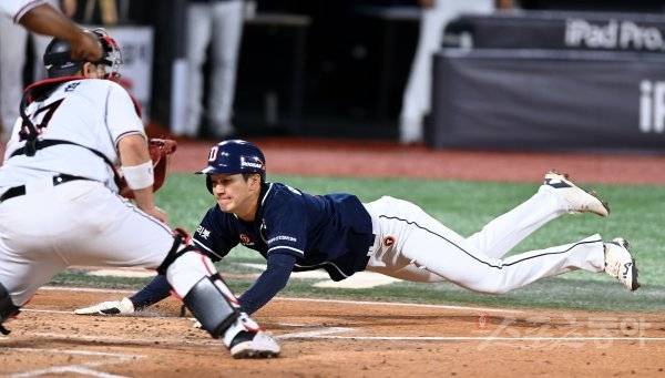 2회초 1사 1, 2루에서 2루타 때 두산 1루 주자 안재석이 득점에 성공하고 있다.