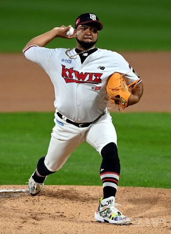 kt 선발투수 데스파이네가 힘차게 볼을 던지고 있다.