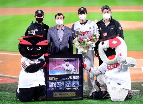 경기에 앞서 kt 구단 최초 100세이브를 달성한 김재윤이 시상식에 참석해 이강철 감독, 정지석 KBO 총재, 이숭용 단장과 기념촬영을 하고 있다.