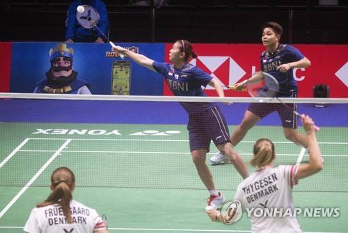 epa09495132 Indonesia's Greysia Polii (back L) and Apriyani Rahayu (back R) in action against Danish players Maiken Fruergaard and Sara Thygesen during their women's doubles game of the group stage tie between Indonesia and Denmark at the BWF 2021 Sudirman Cup Badminton tournament in Vantaa, Finland, 29 September 2021. EPA/MAURI RATILAINEN