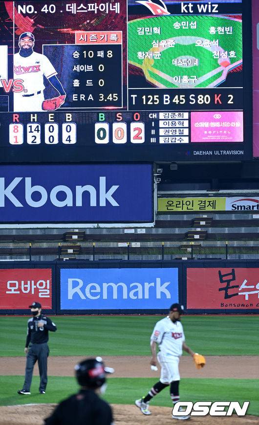 7회초 이닝을 마친 KT 선발 데스파이네가 더그아웃으로 향하는 가운데, 전광판에 뜬 7회까지 125구 14피안타 8실점 기록이 시선을 끈다. 2021.09.29 / dreamer@osen.co.kr