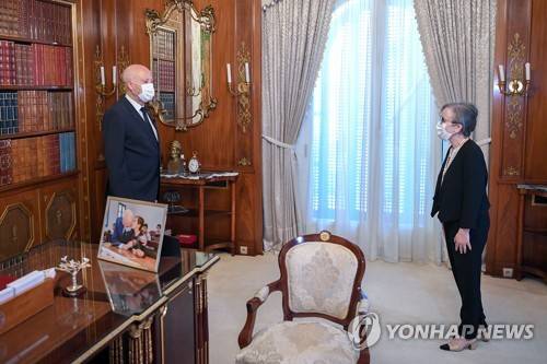 epa09495140 A handout photo made available by the Presidency of Tunisia shows Tunisia's President Kais Saied (L) meeting with newly appointed Prime Minister Najla Bouden Romdhane (R) at the Carthage Presidential Palace in Tunis, Tunisia, on 29 September 2021. Kais Saied instructed Najla Boden, to form a government as soon as possible. Tunisian President Saied suspended the country's parliament and dismissed the Prime Minister Hichem Mechichi on 25 July 2021. EPA/PRESIDENCY OF TUNISIA HANDOUT HANDOUT EDITORIAL USE ONLY/NO SALES